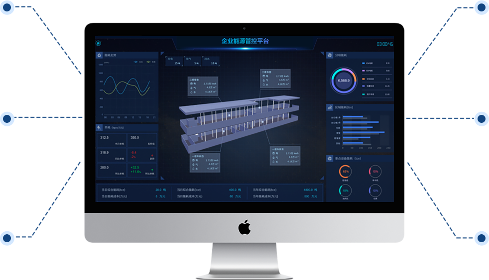 展示企业各类能耗总量、折标值、能源成本、能源消耗趋势、分项能耗占比、区域能源消耗对比,以及当前天气情况、污染情况,并三维展示企业重要工艺或工段的能源消耗动态。